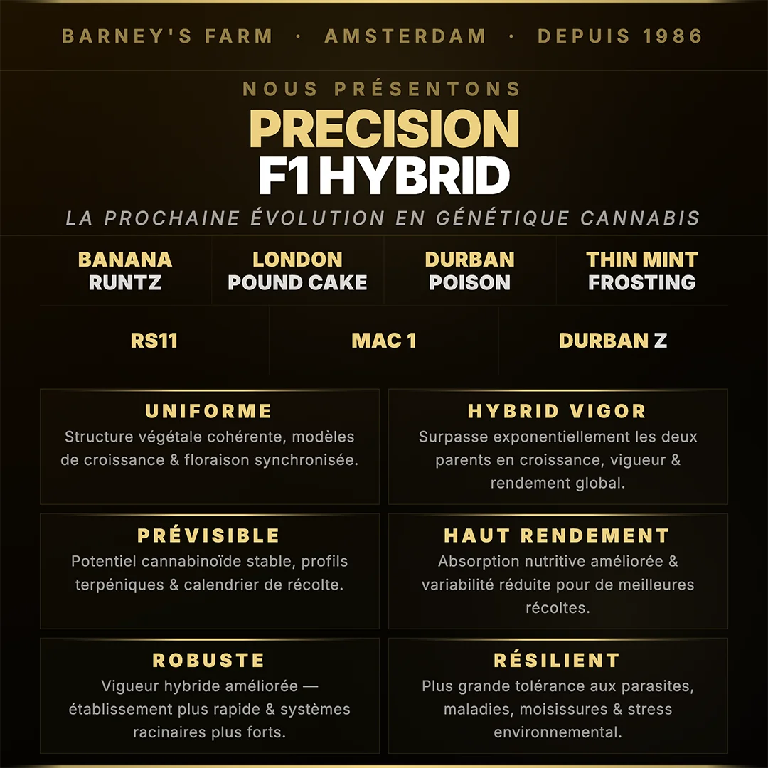 Lire les Détails +Barney's Farm presents Precision F1 Hybrid cannabis strains, meticulously bred for exceptional performance and reliability. With decades of advanced hybridization, these seeds offer unmatched uniformity, vigorous growth, and outstanding results throughout cultivation.